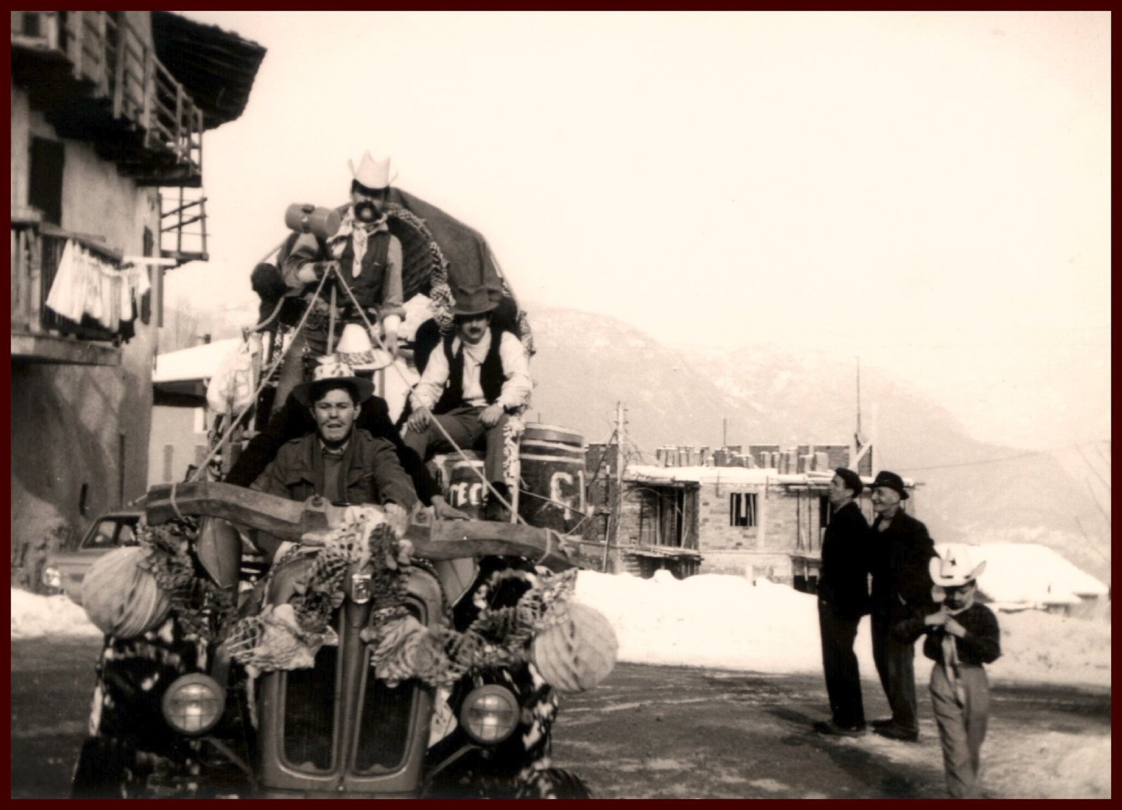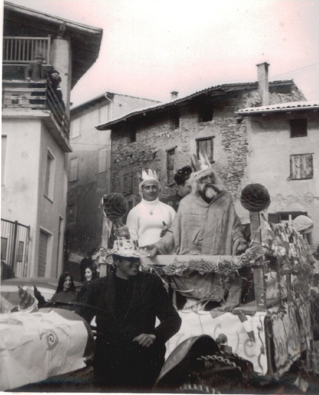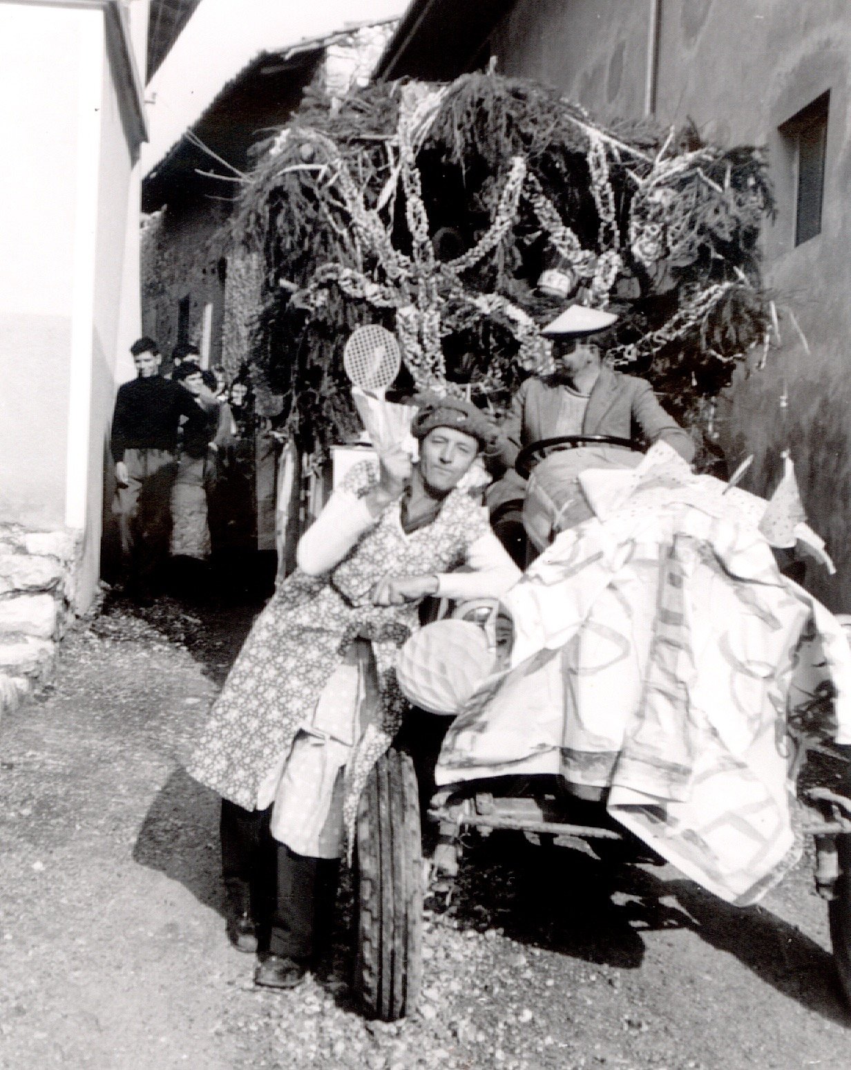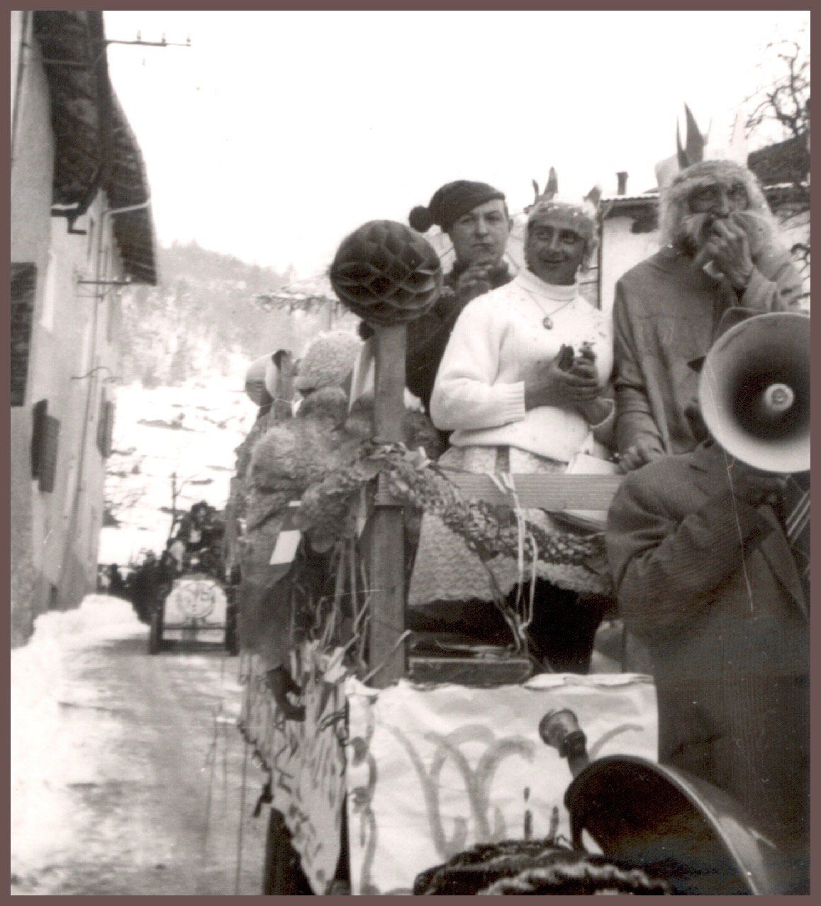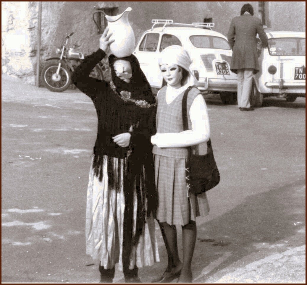 Anche gli uomini, e sottolineo uomini perché allora le donne non partecipavano alla baldoria, erano mascherati alla bene meglio, ossia alla “vate ciava” soprattutto per la mancanza di indumenti idonei allo scopo, ma importante era festeggiare il carnevale; mi sovviene ora il particolare di un tale che si era trasformato in un infante coricato all’interno della slitta, in un giaciglio dotato di coperte di lana, con in testa una cuffietta e in bocca un succhiotto applicato ad un bottiglione di vino.