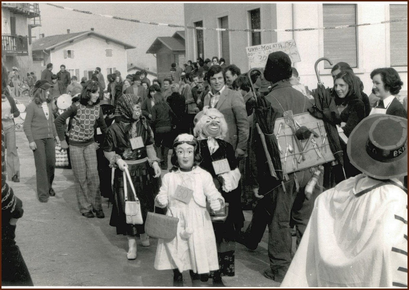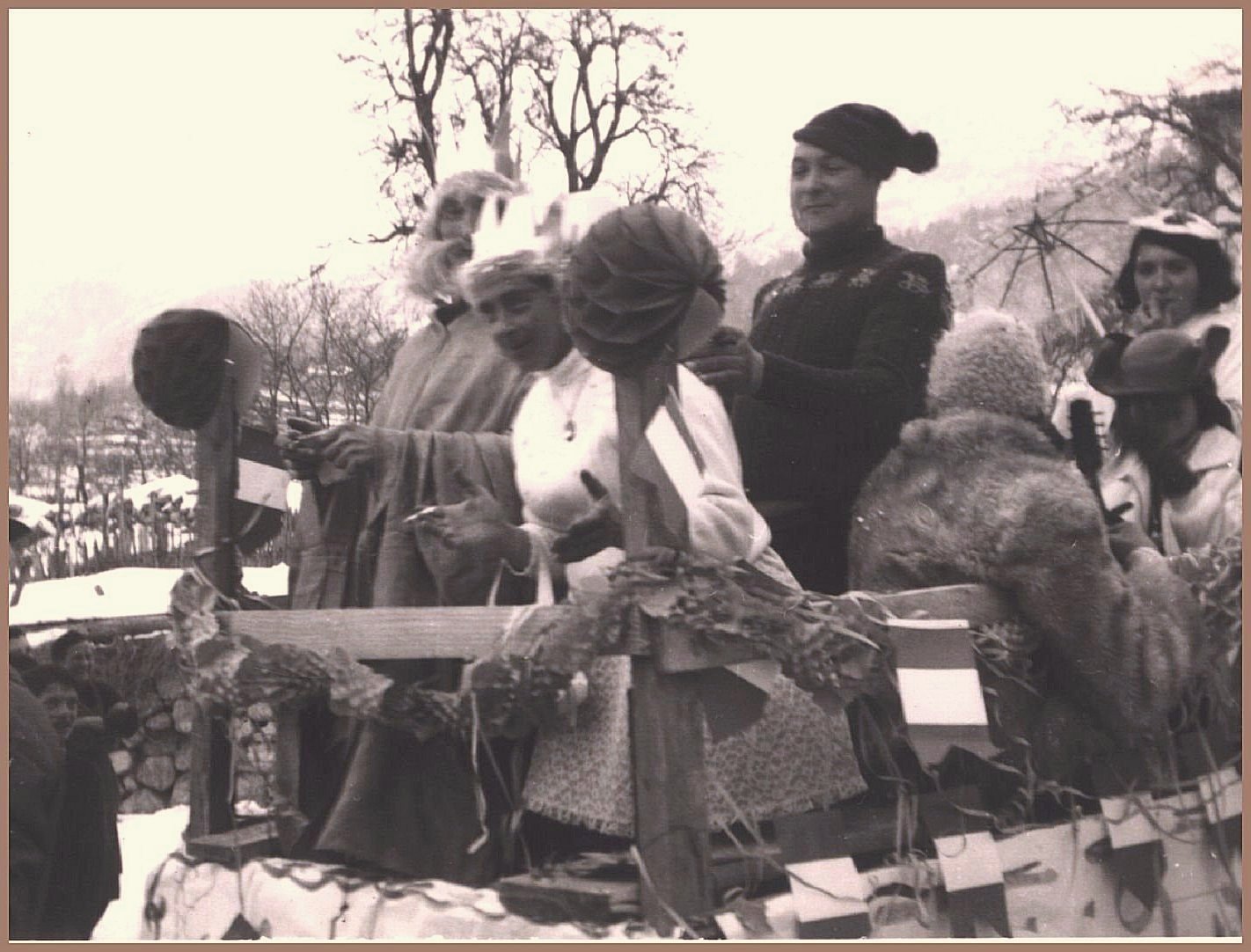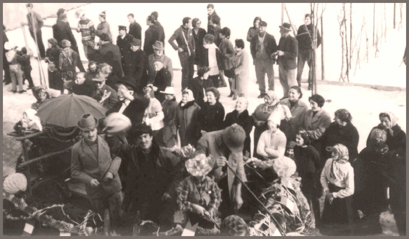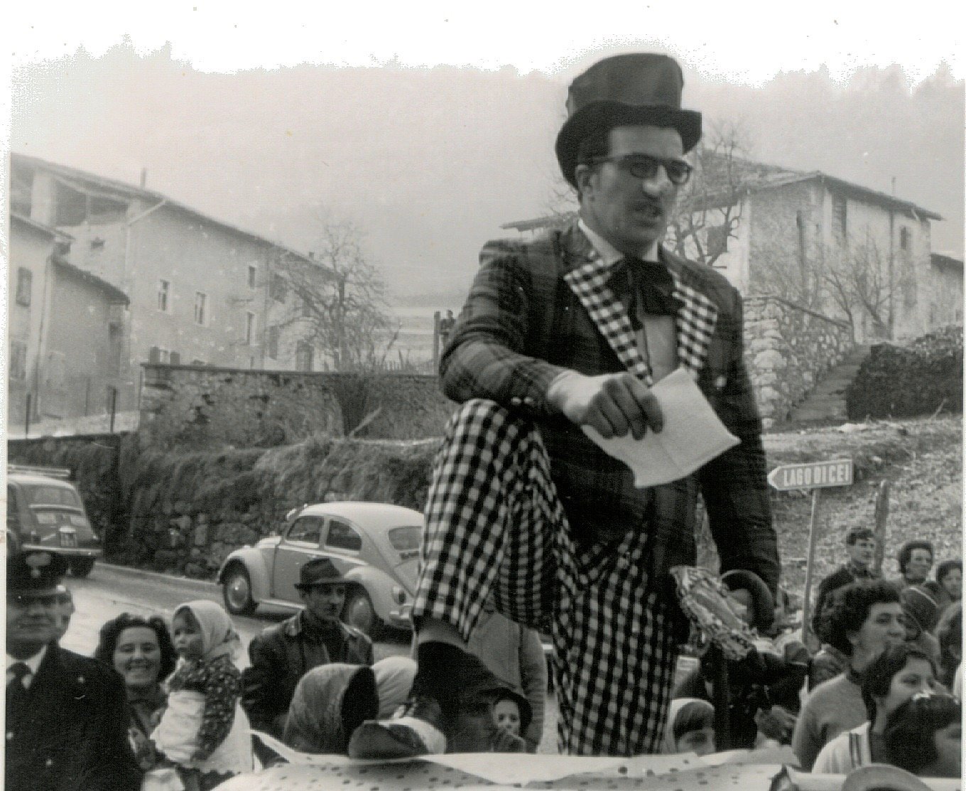 Anche gli uomini, e sottolineo uomini perché allora le donne non partecipavano alla baldoria, erano mascherati alla bene meglio, ossia alla “vate ciava” soprattutto per la mancanza di indumenti idonei allo scopo, ma importante era festeggiare il carnevale; mi sovviene ora il particolare di un tale che si era trasformato in un infante coricato all’interno della slitta, in un giaciglio dotato di coperte di lana, con in testa una cuffietta e in bocca un succhiotto applicato ad un bottiglione di vino.