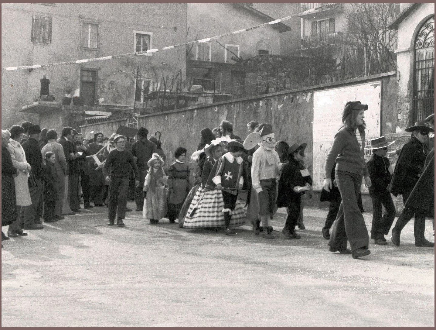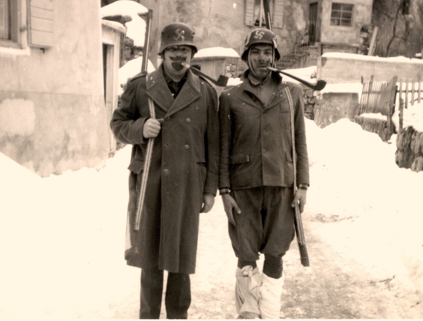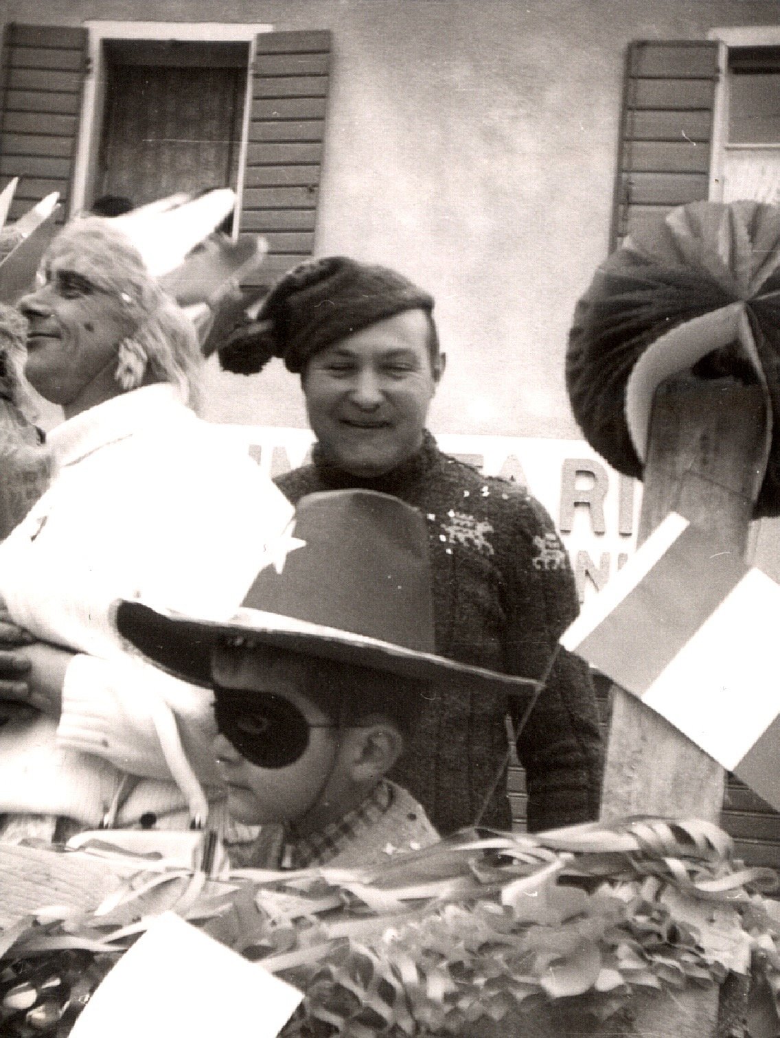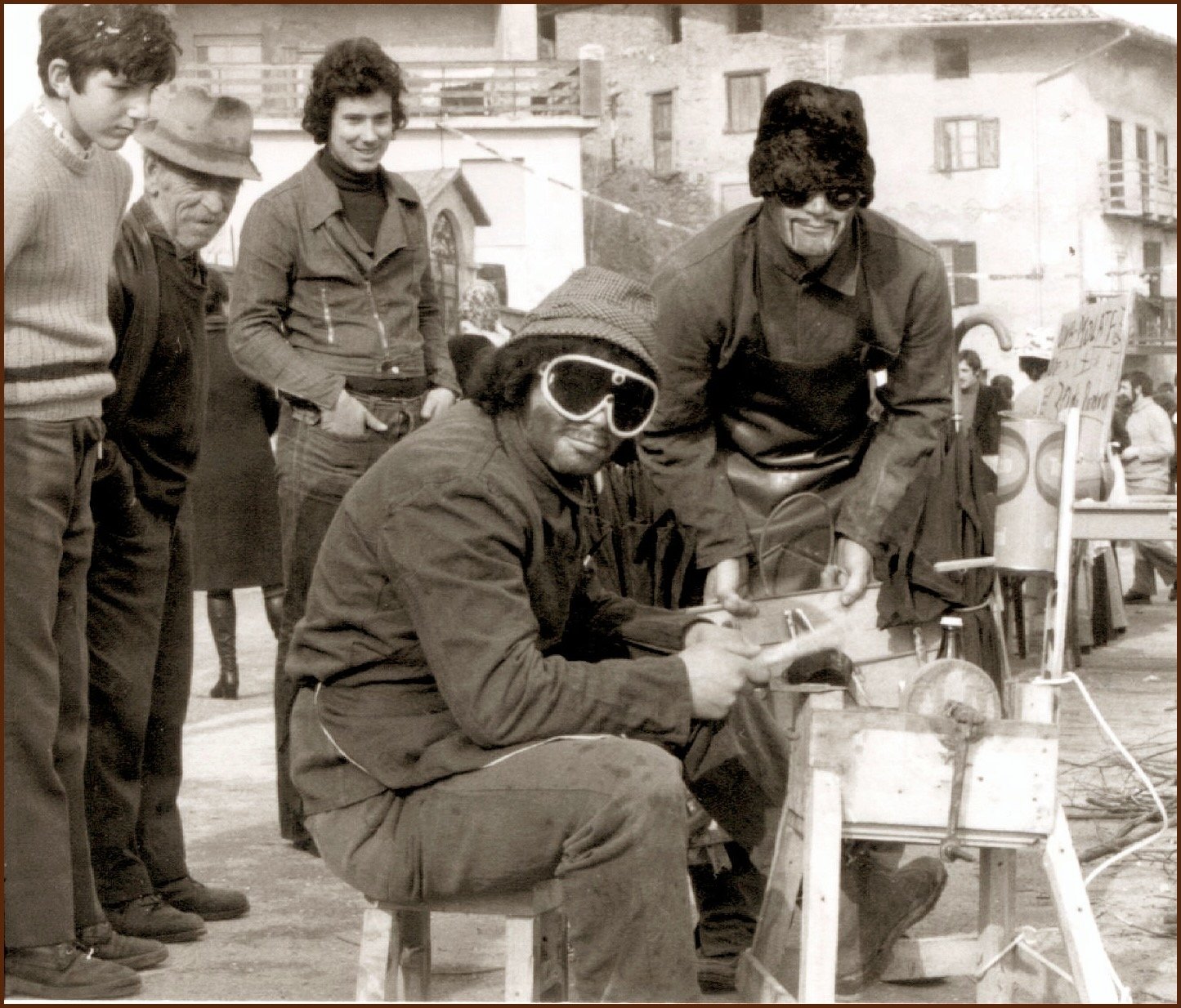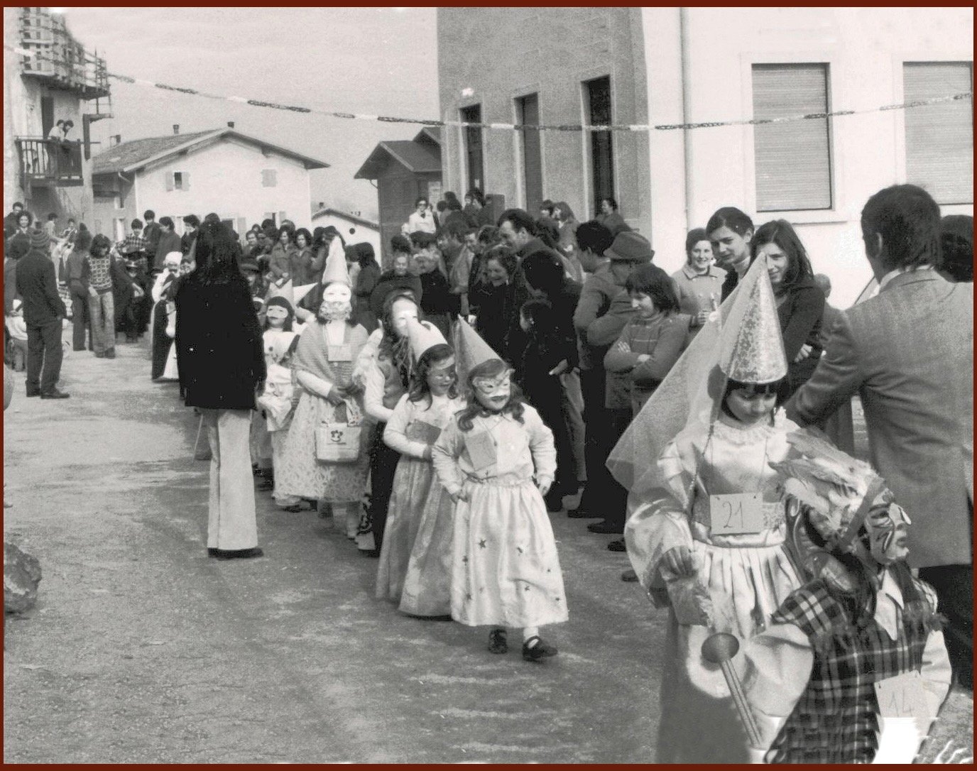 Anche gli uomini, e sottolineo uomini perché allora le donne non partecipavano alla baldoria, erano mascherati alla bene meglio, ossia alla “vate ciava” soprattutto per la mancanza di indumenti idonei allo scopo, ma importante era festeggiare il carnevale; mi sovviene ora il particolare di un tale che si era trasformato in un infante coricato all’interno della slitta, in un giaciglio dotato di coperte di lana, con in testa una cuffietta e in bocca un succhiotto applicato ad un bottiglione di vino.