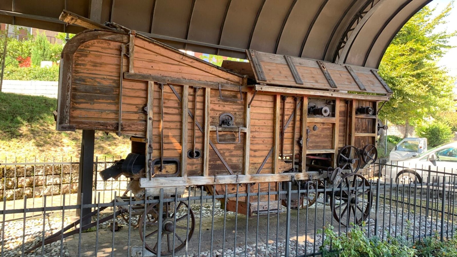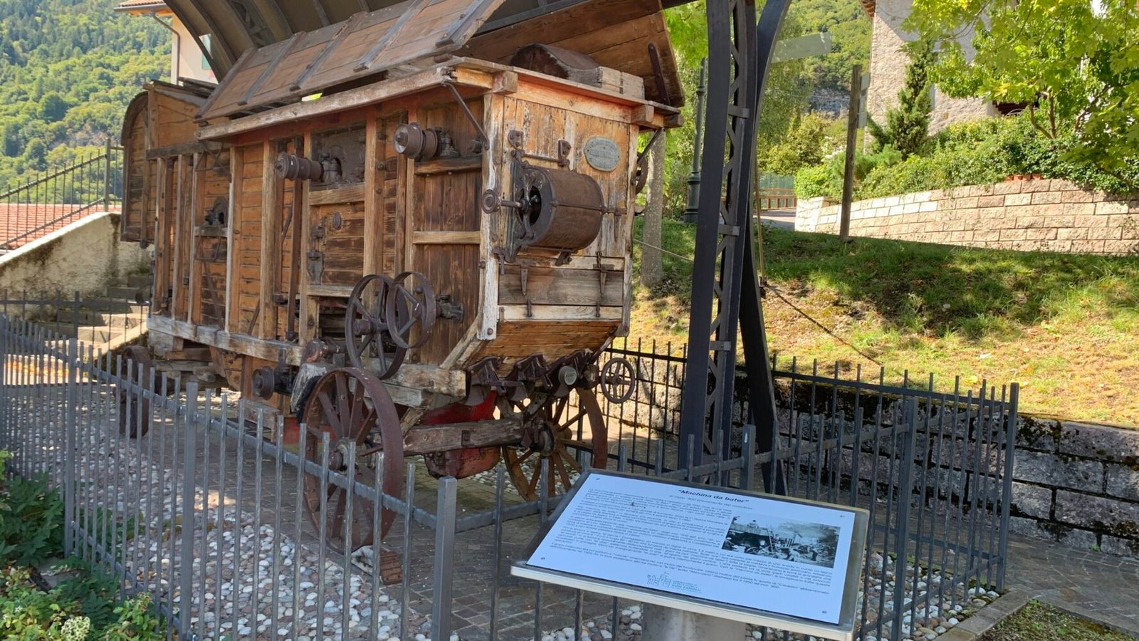 “machina da bater” (trebbiatrice) fu utilizzata a Castellano dal 1935 circa, fino al 1958. Veniva collocata in questa piazza detta “al Barc”allora più estesa; strada e attuali giardini erano un unico luogo. L’ultima “machina da bater” posizionata qui fu quella della S.A.V. (Società Agricoltori Vallagarina) che a turno serviva i vari paesi della valle. A Castellano si fermava per diversi giorni.