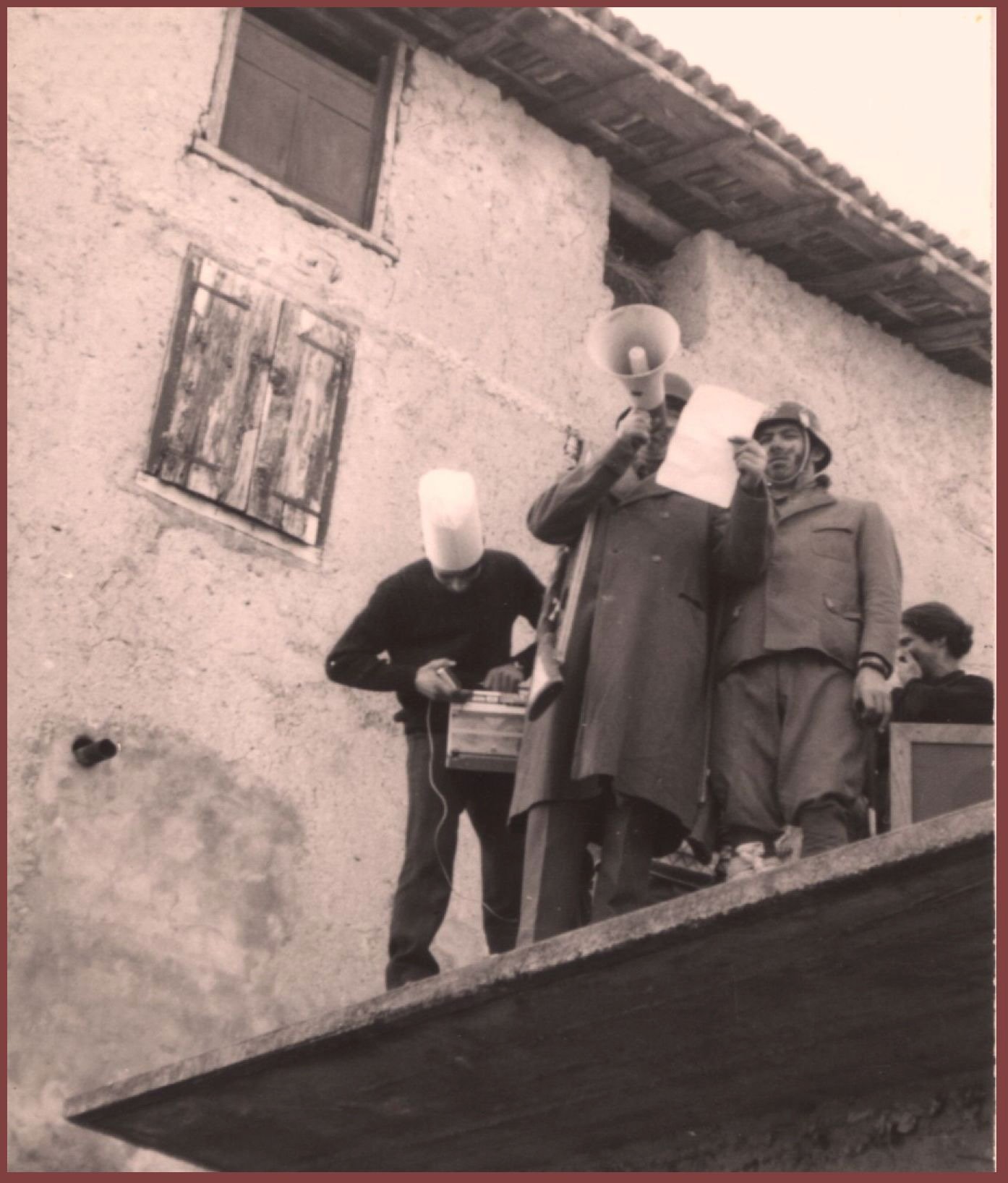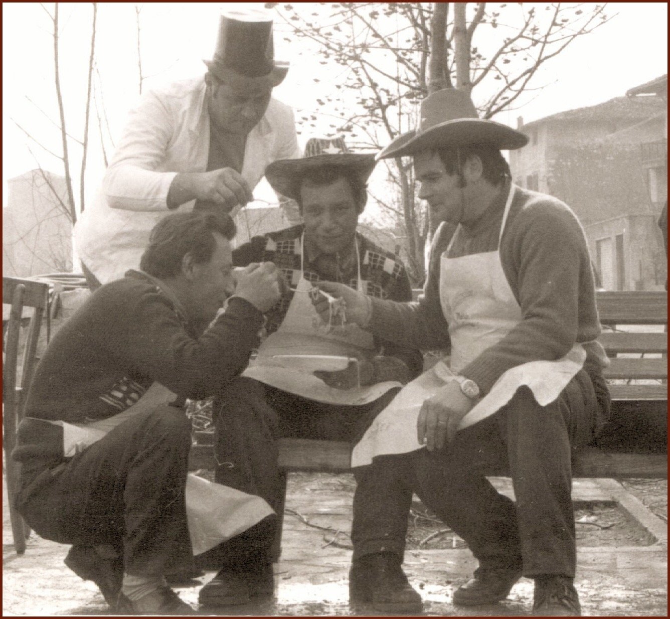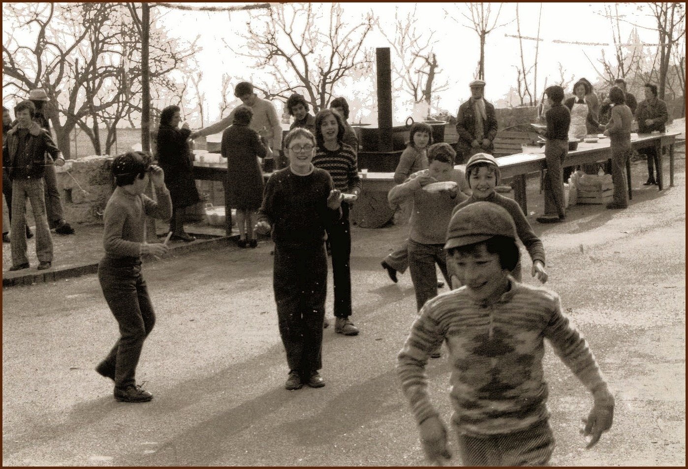 Ho netto il ricordo dell’anno 1954, allora avevo sei anni, con la stufa fumante in una piazza Barco invasa dalla neve perché allora le nevicate erano molto copiose; veniva pure allestita una grande slitta dotata di improvvisata copertura con telo e frasche, in cui trovavano in genere posto coloro che ormai avevano abbondantemente superato il ragionevole tasso alcolico. La slitta veniva trainata e spinta da uomini lungo un pezzo di strada del paese e a tal proposito rammento con chiarezza come la resistenza all’avanzamento in alcuni tratti ostici, offerta da un manto nevoso non compiutamente rimosso dalla “rotta”, richiedesse particolari sforzi ed invettive varie.