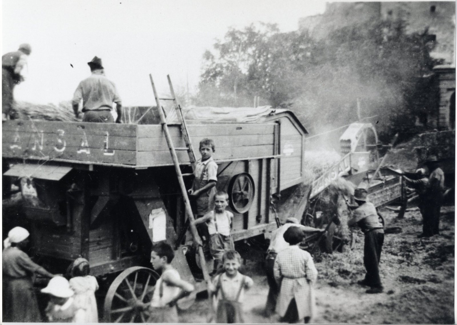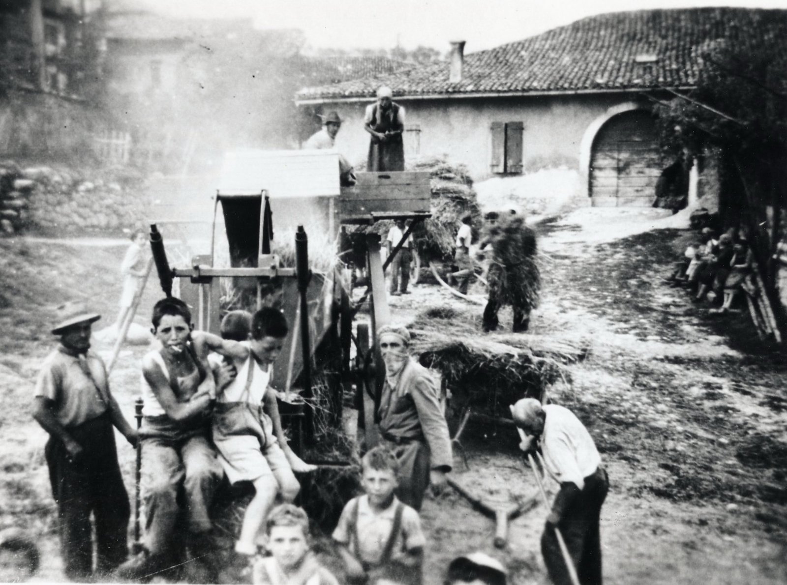Alla “machina da bater” vi lavorano più persone, in alto si introduceva il frumento essiccato, dalle aperture in basso uscivano i chicchi di grano puliti (ventilati e setacciati) e la paglia da legare in balle. Il tutto era mosso da una trattrice per mezzo di lunghe e pericolose cinghie piane in cuoio.